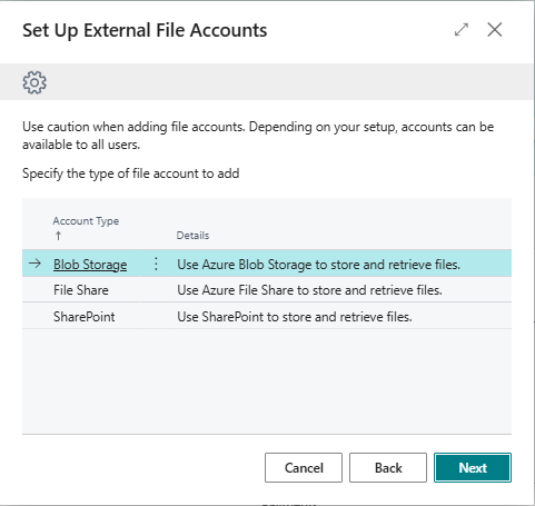 2. Specify the type of file account to add (in this blog we will see how it connects to Azure Blob Storage)